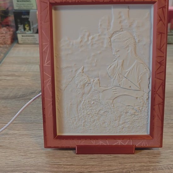 Der Rahmen enthält einen 2m langen LED-Streifen (5V 10W) und ist dimmbar (kein Netzstecker enthalten), dieser kommt ebenfalls aus dem 3D-Drucker und kann in verschiedenen Farben geliefert werden. Der Rahmen kann an die Wand gehängt werden oder wird mit dem mitgelieferten Standfuß aufgestellt.